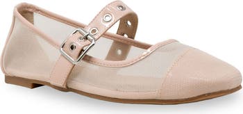 An airy mesh upper allows your foot to breathe in a Mary-Jane flat secured with a glossy grommet strap and buckle for day-to-night style.