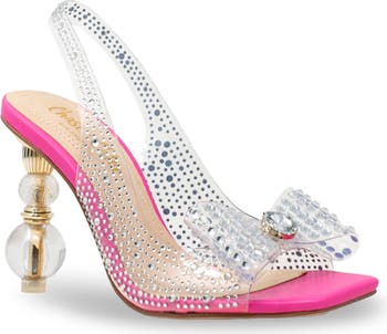 Sparkle like Cinderella with this glamorous crystal-embellished clear sandal boasting a squared open toe framed by a dazzling bow and sculptural glass heel.