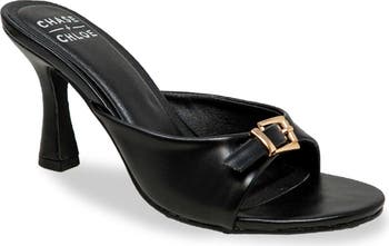 A contoured heel lofts this slide sandal to new heights while polished buckle hardware lends subtle shine to each look.