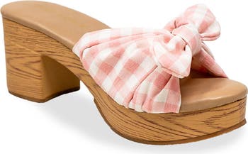 Step into sunny-day style with these slide sandals featuring knotted vamp strap and a chunky platform wrapped in a faux-wood platform for a touch of texture.