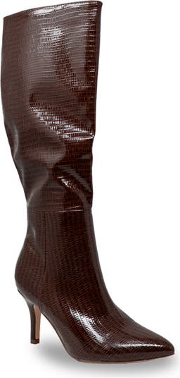 A pointy-toe pair of mid-calf boots lofted by a slight stiletto heel are designed with arch support for comfort.