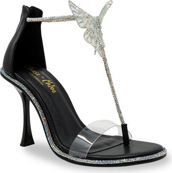 Dainty rhinestones dazzle the slender T-strap and trace the footbed of a special-occasion sandal featuring a sculpted fluttering butterfly at the ankle.