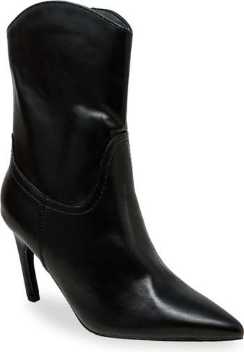 A pointy toe and angled heel balance a semi-slouchy bootie fashioned with a curved topline and side zipper for easy entry.