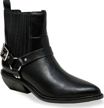 A gleaming O-ring and buckle hardware bring Western charm to this easy-wear Chelsea boot framed by a pointed toe and stacked block heel.