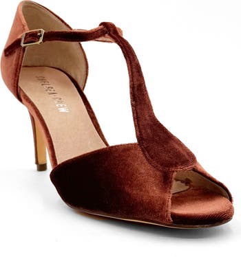 A peep toe and T-strap silhouette make this velvety pump a perfectly poised option for any occasion.