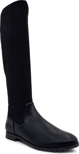 Perched on a block heel, a streamlined knee-high boot is styled with knit panels for an undeniably chic look.