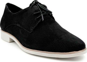 A textured nubuck leather derby offers classic style in a plain-toe silhouette with a lightly cushioned footbed and textured sole.