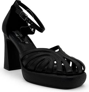 Show off glamorous retro style in a caged sandal lifted by a wrapped platform and chunky block heel.