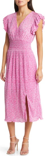 Easy-moving plissé pleats cover this surplice-neck midi styled with layered ruffle sleeves and a shapely smocked waist.