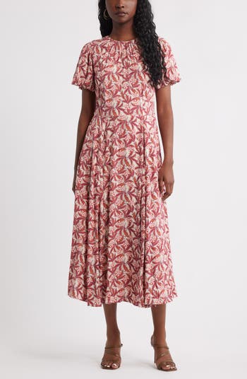 Pretty puff sleeves and dainty shirring gentle a staple midi dress cut from a lightweight fabric.