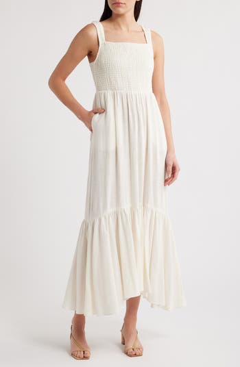 Sway through your day in this lightweight linen-kissed maxi designed with a smocked bodice for shape and a flouncy tiered skirt for graceful movement.