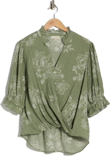 Fanciful frills outline the neckline and cuffs of this weekend-ready top cut from textured-crinkle fabric and finished with a twisted high-low hem.