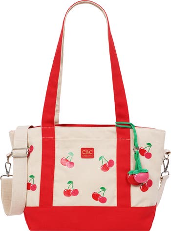 Ripened cherries deliver unmistakable warm-weather charm to a spacious tote bag boasting an open top and roomy interior that gives you easy access to daily essentials and extras.