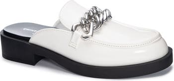 Gleaming chain-link hardware and a moc toe lend eye-catching elements to a loafer-inspired mule lifted by a modest block heel.