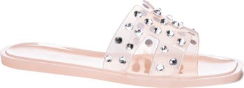 Shimmering rhinestones dot the clear vamp strap on this vinyl slide sandal with a barely there aesthetic.