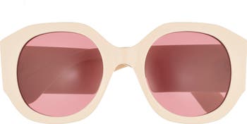 Retro-inspired round sunglasses with pink-tinted lenses will make a statement wherever the sun takes you.