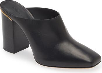 A hidden platform lends unexpected comfort to this square-toe mule set on a steep, stacked block heel.
