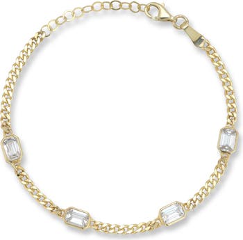 Bezel-set cubic zirconia stations bring scintillating shine to a sterling silver bracelet plated in 14-karat gold.