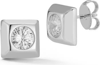 Bezel-set round-cut cubic zirconia center these square-shaped studs that's rendered from rhodium or 18-karat-gold plate.