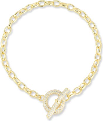 Warm 14-karat-gold plating and shimmering cubic zirconia define a delicate chain bracelet secured by a toggle clasp.