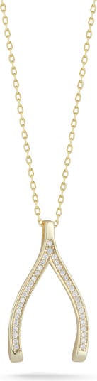A delicate chain necklace warmed by 14-karat-gold plating is centered by a wishbone-shaped pendant shimmering with cubic zirconia.
