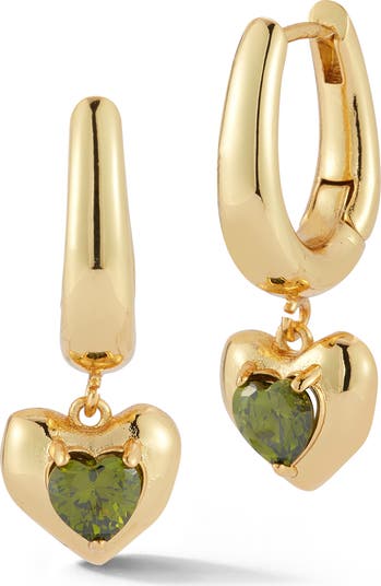 Dainty heart charms filled with cubic zirconia anchor these hoops that's rendered from 18-karat-gold plate.