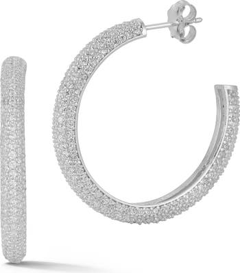 These hoop earrings are made from sterling silver, plated in rhodium and adorned with pavé cubic zirconia for a dazzling, high-shine finish that catches every eye.