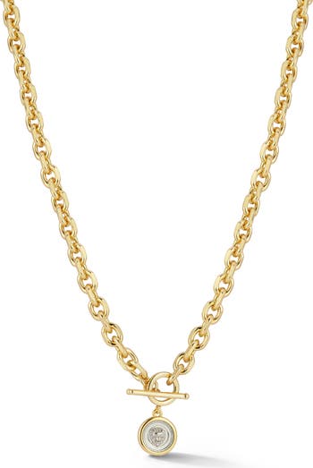 A delicate chain necklace offers a versatile base for a two-tone lion embossed coin pendant. A fine 18-karat gold plating gives a lasting luster to a toggle necklace.
