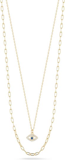 Pavé CZ dazzles on a evil-eye pendant suspended from a layered necklace composed of mixed chains plated in gleaming 14-karat gold.