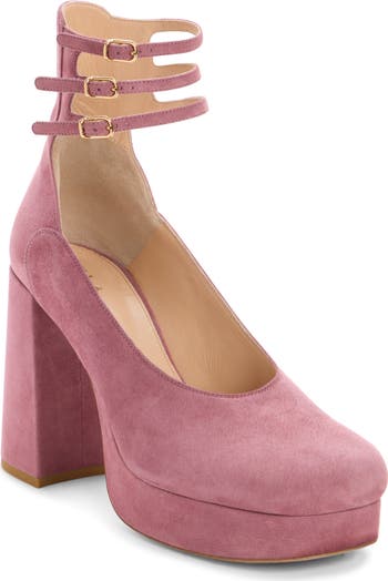 Drama defines this platform-hoisted suede pump designed with a towering block heel and a trio of slender ankle straps.