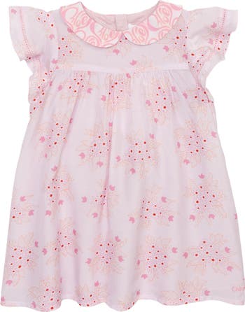 Ornate bouquets scatter this precious silk-kissed dress flourished with ruffles and a logo-traced collar that perfectly frame your little darling.