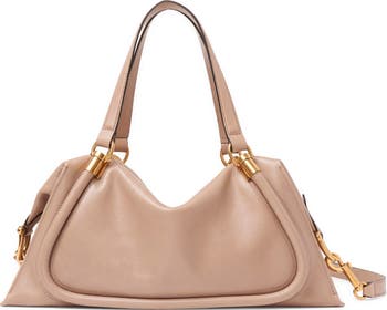 Chloé updates its archival Paraty shoulder bag with this new, shiny-calfskin version that combines sharp lines with rounded curves and golden hardware.