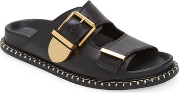 Meticulous stitching traces the welt of a Spanish-crafted calfskin-leather slide finished with the line's signature logo-engraved hardware.