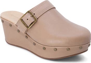 Antiqued studs at the midsole and a buckled instep strap add visual intrigue to a burnished leather mule lifted by a chunky platform and integrated wedge heel.