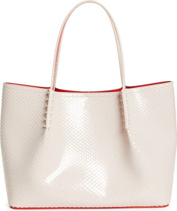 Spiked metal accents anchor the over-the-shoulder handles of a spacious tote made from Italian calfskin in a snakeskin-embossed patent finish. The iconic style is lined with a signature lipstick-red interior, while an embossed logo script brands the base for stability and instant brand recognition.