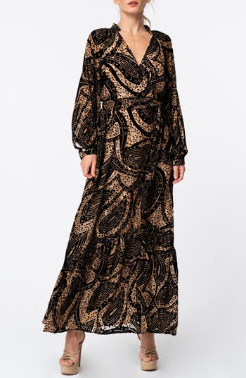 Get ready for your next party in this flowy burnout faux-wrap dress accented with a drapey tie belt and a low collar around the face-framing V-neck.
