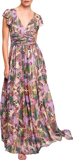 Fluttery sleeves and a full skirt with a front slit bring runway-ready movement to a metallic-tinged maxi dress shaped with delicate ruching at the waist.