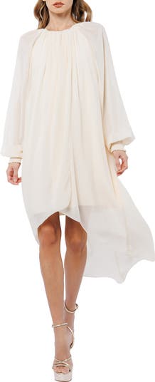 A sweeping high-low hem enhances the everyday drama of this light and airy longsleeve dress that gathers at the neckline.
