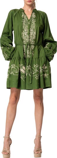 A flounced hem brings extra movement to this embroidered minidress framed by voluminous long sleeves and hugged by a slender tie belt.