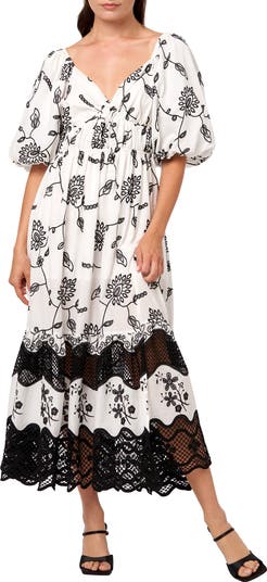 This cotton dress is adorned by beatuifully embroidered blooms and lacy insets that add to the sweet energy of your look.