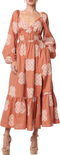 Embroidered medallions animate a summery dress, cut from cotton and linen and finished with a wide ruffle.