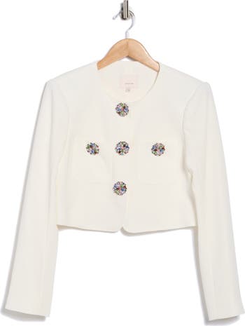 Multicolor crystal buttons bedazzle this collarless blazer fashioned in a cropped silhouette and finished with handy patch pockets.