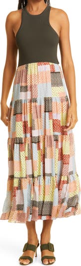 This mixed-media dress with a cheeky back cut-out is highlighted by a hypnotic patchwork patterned skirt with ruffled tiers.