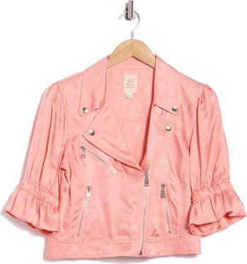 Pretty puff sleeves with ruffled cuffs sweeten this moto-inspired jacket cut from lustrous satin in a romantic hue.