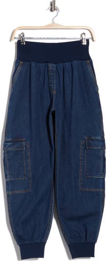 Side cargo pockets play up the relaxed vibes of these ankle-length joggers fashioned from stretch-kissed denim.