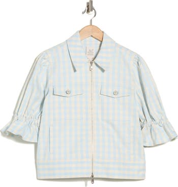 Gingham checks bring picnic-worthy appeal to a denim jacket complete with frilly cuffs and a two-way zipper for easy layering.