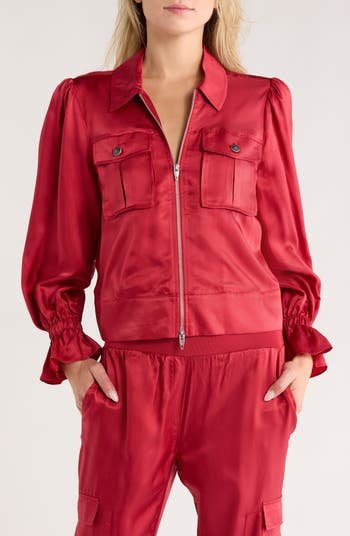 Billowy balloon sleeves with ruffled cuffs amplify the charm of this luxe satin-twill jacket accented by a sporty two-way-zip closure and utility-inspired pockets.