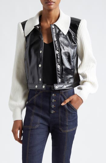 A knit collar and sleeves put a chic and cozy spin on a sleek faux-leather jacket that's ideal for season-spanning wear.