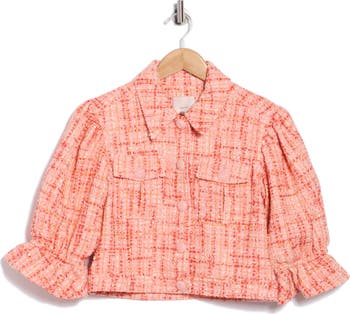 Ruffled puff sleeves bring instant charm to this tweed-like bouclé jacket fashioned in a sweetly cropped silhouette.