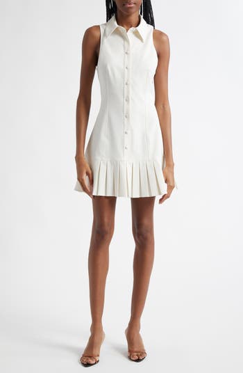 A sleeveless shirtdress cut in svelte drop-waist silhouette offers flirty appeal with a kicky row of pleats highlighting the hemline.